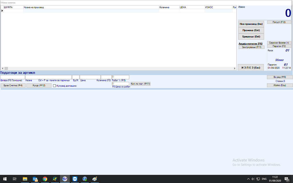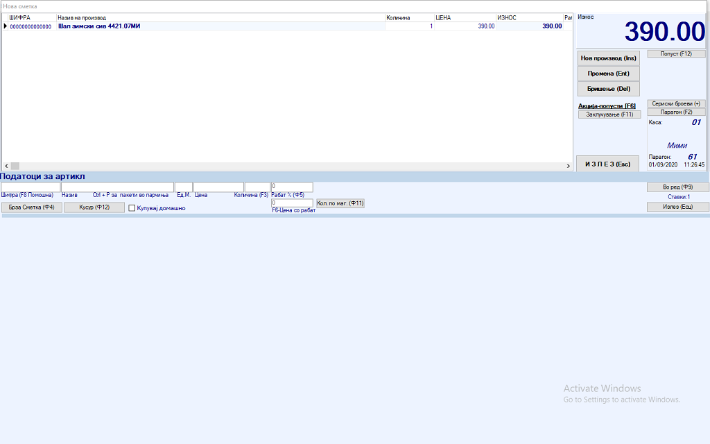 Копчето за нов производ повторно ни го отвара долниот дел од касата со можност за внесување на нов производ.