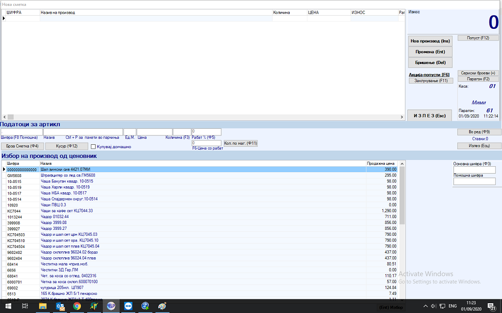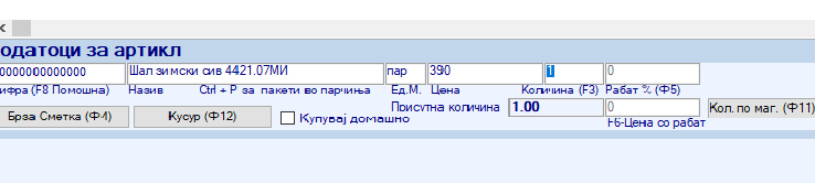 Откако ќе го одбреме производот кој сакаме да го продадеме со Enter истиот се запишува соодветно неговата шифра, назив, единечна мерка, цена која е соодветна со цената внесена од шифрарникот на производи.
