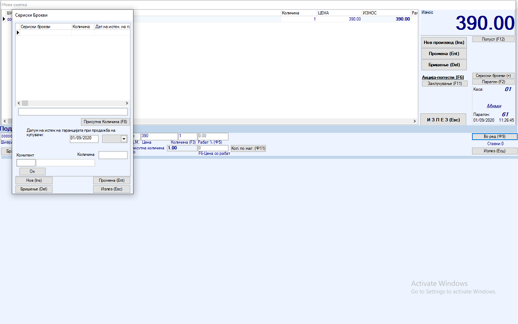 Доколку се работи за продажба на производ со сериски број дополнително се отвара мал прозорец на кој ќе треба да го внесеме серискиот број за производот кој го продаваме.