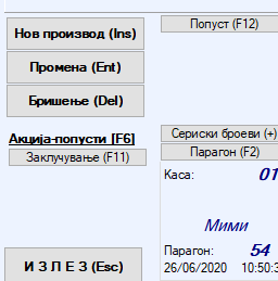 По внесувањето на сите производи со ESC со тастатурата се исклучува долниот дел од касата и се ослободуваат копчињата кои ги имаме во горниот дел од екранот.