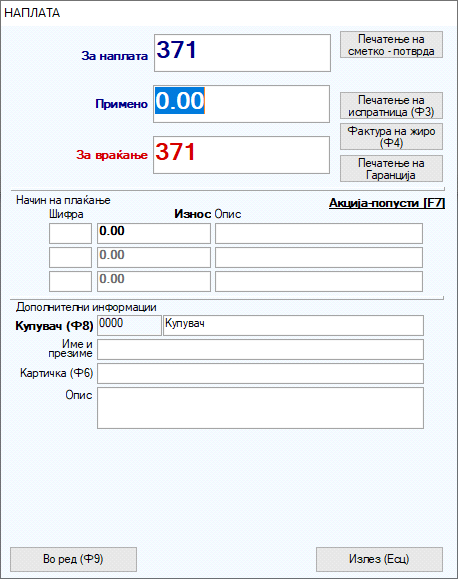 Во начин на плаќање со . (точка) Enter програмот ни отвара дополнителен прозорец во кој можеме да отвориме различни видови на плаќање. Најчесто како начини на плаќање се отвараат во готовина и картици ама може да се отворат дополнително и наплата со картици на пример посебна евиденција за наплата со Виза картички, Дајнерс и сл.