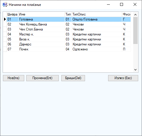 Нови начини на наплата се отвораат преку копчето нов со внесување на податоци како шифра, опис и во делот фискал се одбира каква е наплатата, Г- готовина, К- кредитна картичка се потврдува со копчето ВО РЕД.