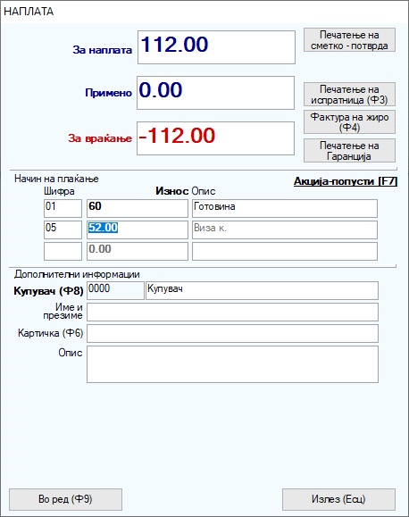 Со одбирање на соодветната наплата и потврдување на копчето ВО РЕД ф9, на фискалниот принтер се печати фискална сметка.
