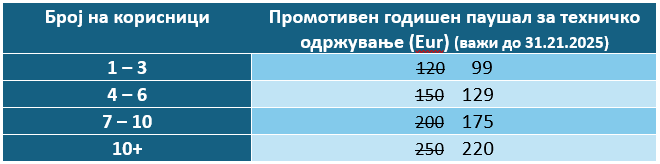 Цената за ваков тип обезбедување непречено, загарантирано и безбедно работење на вашиот систем во иднина, ја сведовме на минимално исплатливи, една до три незадолжителни интервенции годишно. Од наше искуство, пакет надградби би биле реализирани најмалку еднаш, а по потреба два до три пати, или повеќе годишно. Наплатата ќе биде за една година однапред, во износ зависно од бројот на инсталирани кориснички лиценци и тоа во пакети, според следната табела: