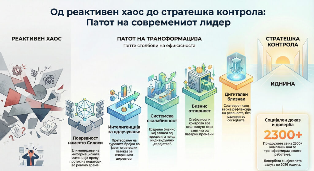 Во изминатата деценија, софтверот во компаниите се третираше како помошна алатка – дигитален тефтер за евиденција на трансакции. Но, во 2026 година, границата помеѓу бизнис стратегијата и технологијата е целосно избришана. За еден сопственик или директор, прашањето веќе не е „кој софтвер го користиме“, туку „дали нашата дигитална архитектура поддржува одржлив раст“.